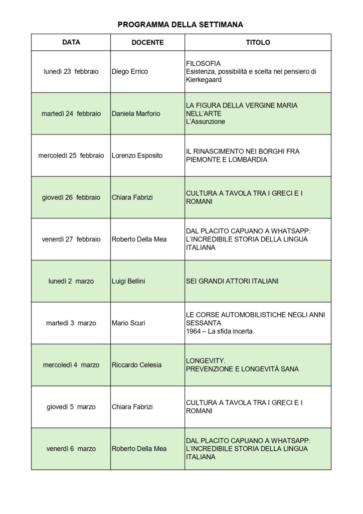 - Mercoledì 25 febbraio, Lorenzo Esposito: IL RINASCIMENTO NEI BORGHI FRA PIEMONTE E LOMBARDIA (invece di Gianni Di Bella)